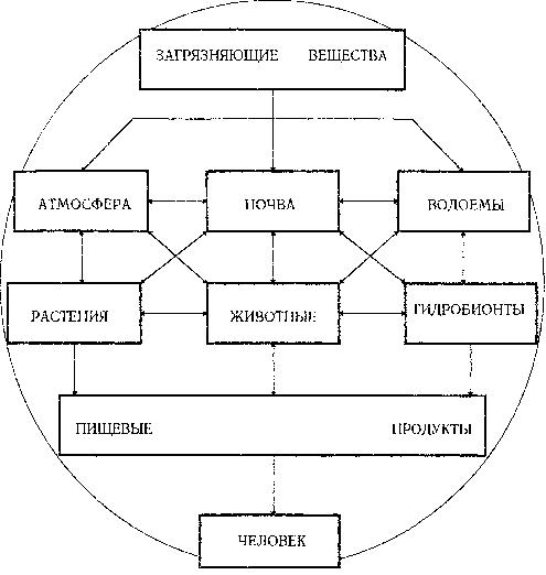 Чтобы яснее представить масштабы поступления вредных хими-ческих веществ в ОС, действию которых подвергается организм современного человека, достаточно заметить, что только за период цивилизации в биосферу было внесено более 1 млн. новых химических веществ, синтез которых интенсивно осуществляется человеком и сегодня, достигая десятков тысяч наименований в год. Причем с точки зрения охраны чистоты и постоянства внутренней среды организма большую опасность представляют чужеродные вещества, которые не только попадают в организм по пищевым цепям (через воду, воздух, продукты питания), но и кумулируются во внутренних органах и тканях в течение длительного времени (рис. 3).